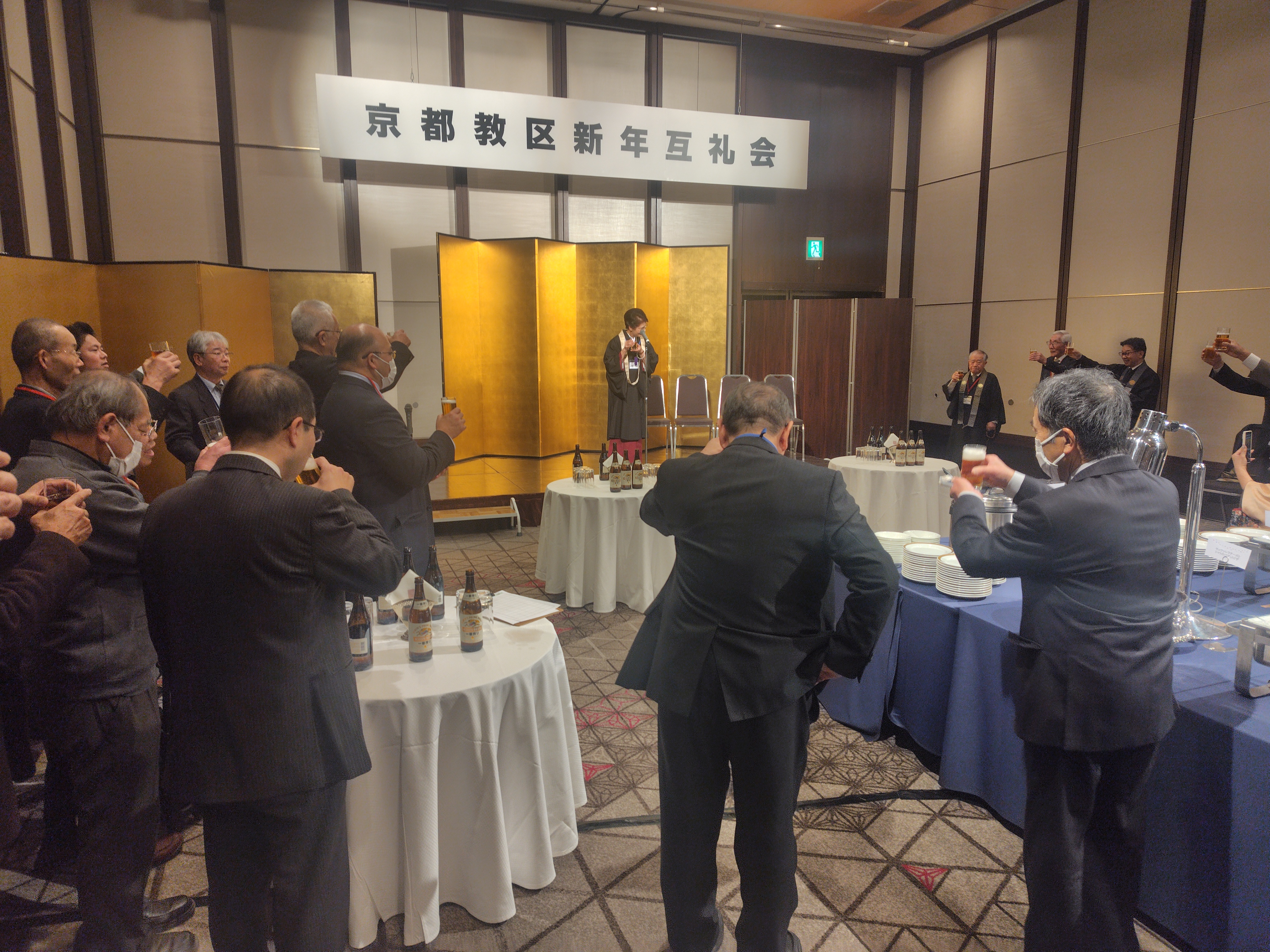 まず深尾京都教区教区会議長の挨拶、続いて宮戸教務所長の挨拶がありました。三原教区坊守会長の乾杯の音頭で祝宴が始まりました。