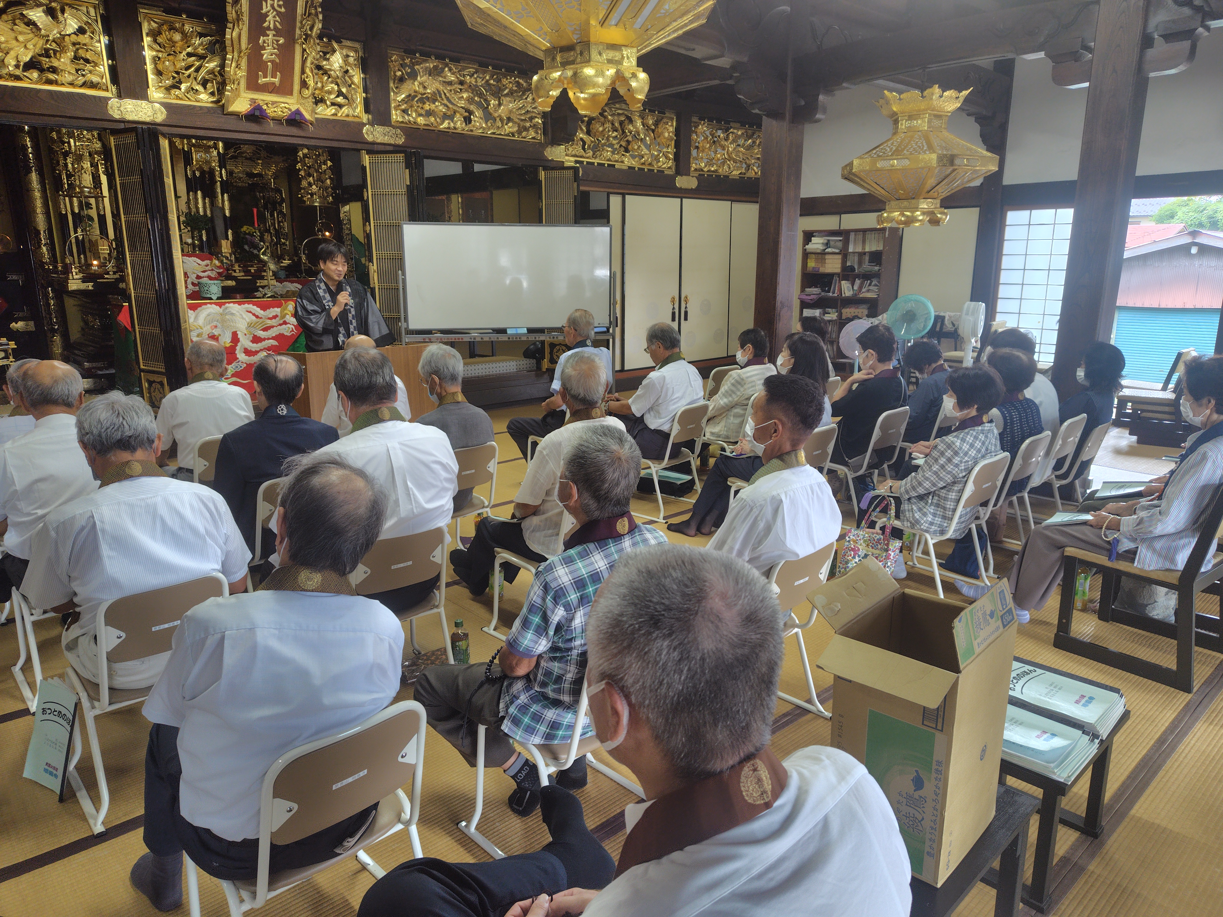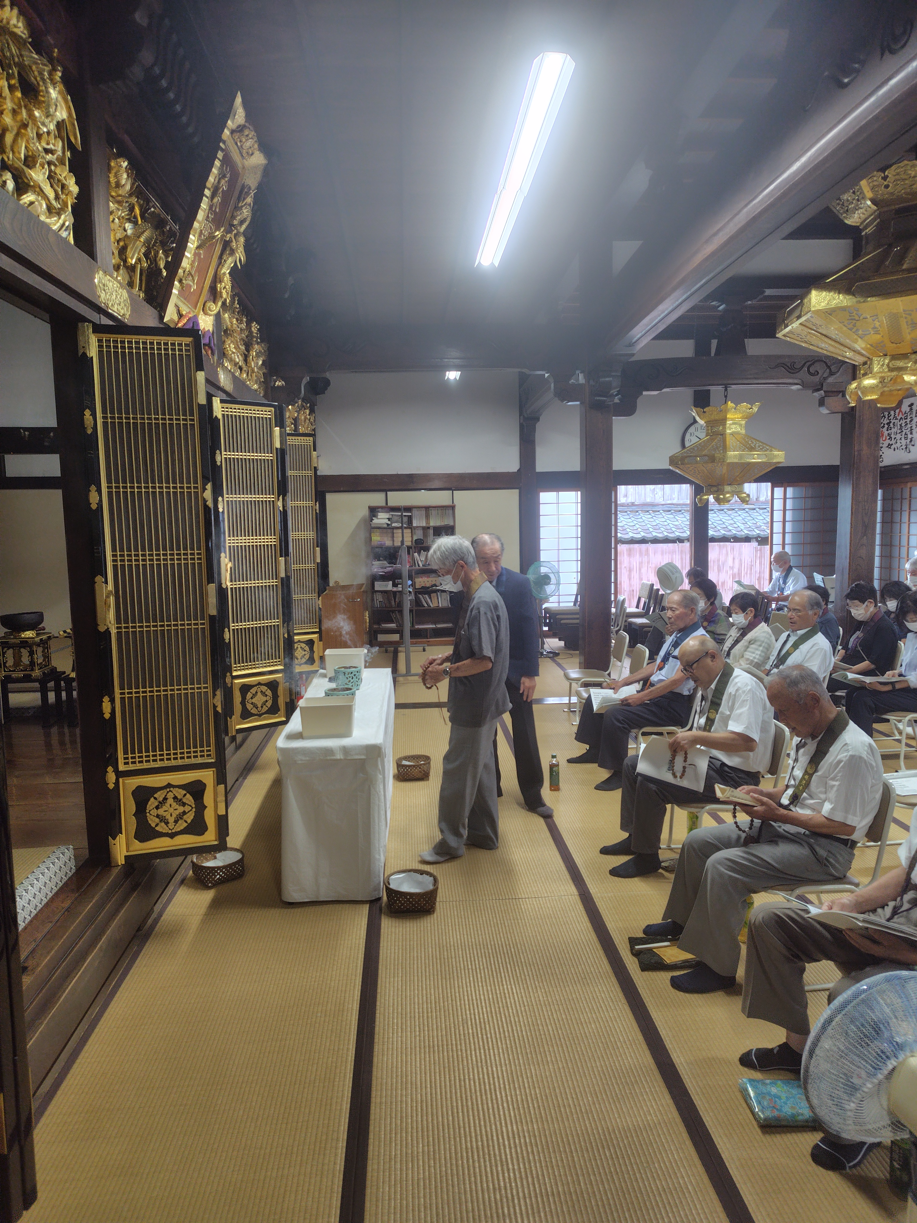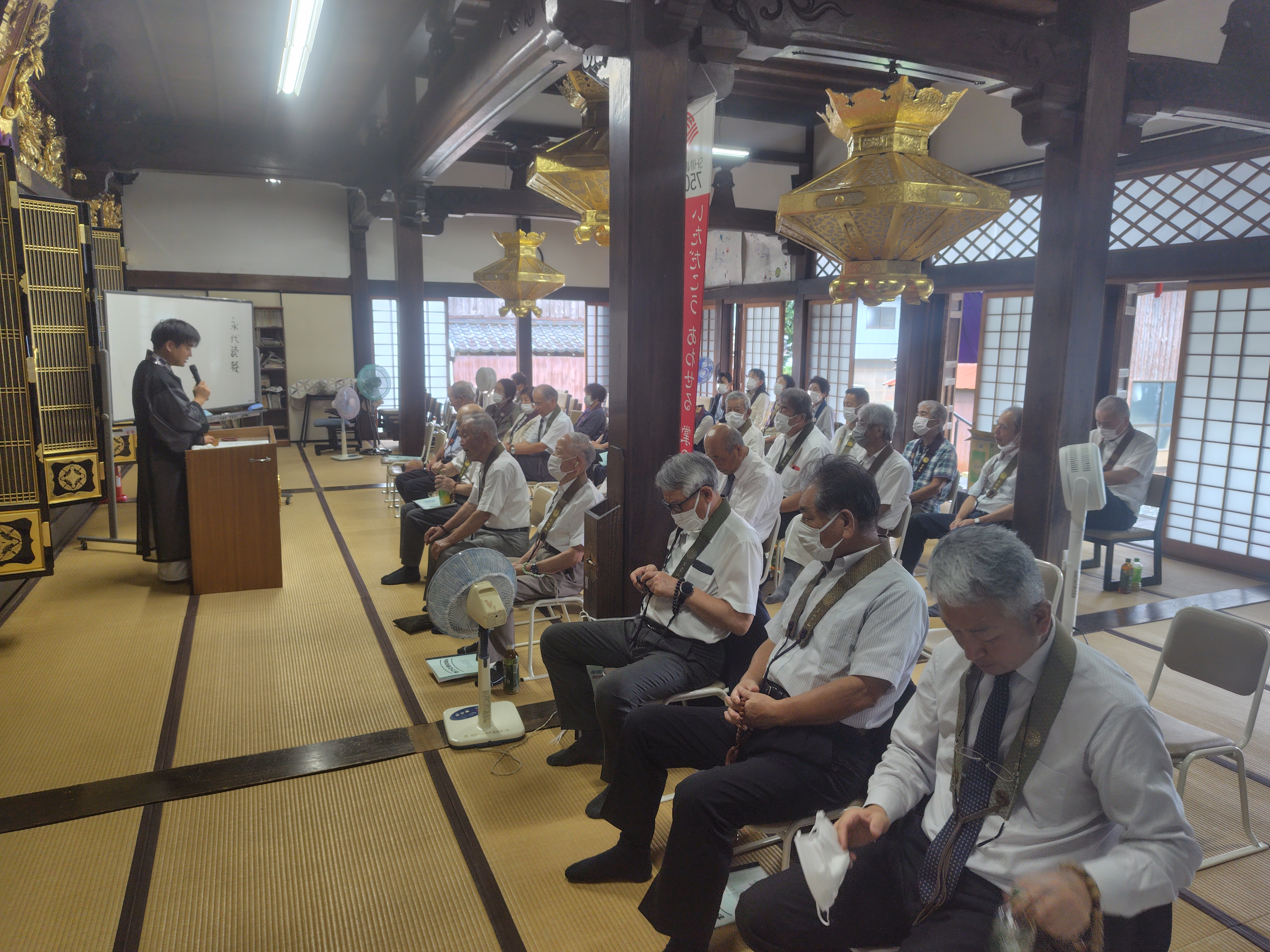 9月20日(土)秋の永代経を勤めました。午前9時に役員が集合し準備をした後、午前10時からお勤めをしました。伽陀・先請弥陀入道場、仏説阿弥陀経、正信偈同朋奉讃の次第で、約40名の参詣者と共にお勤めをしました。午前中は住職が法話をしました。