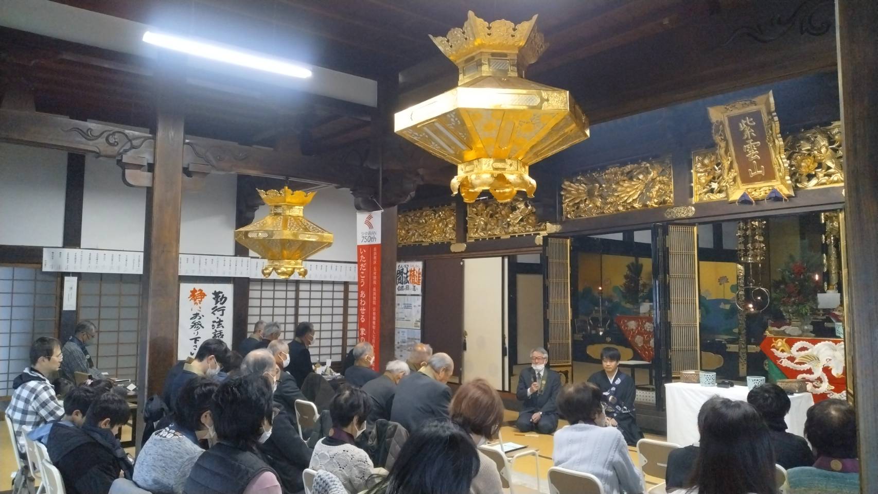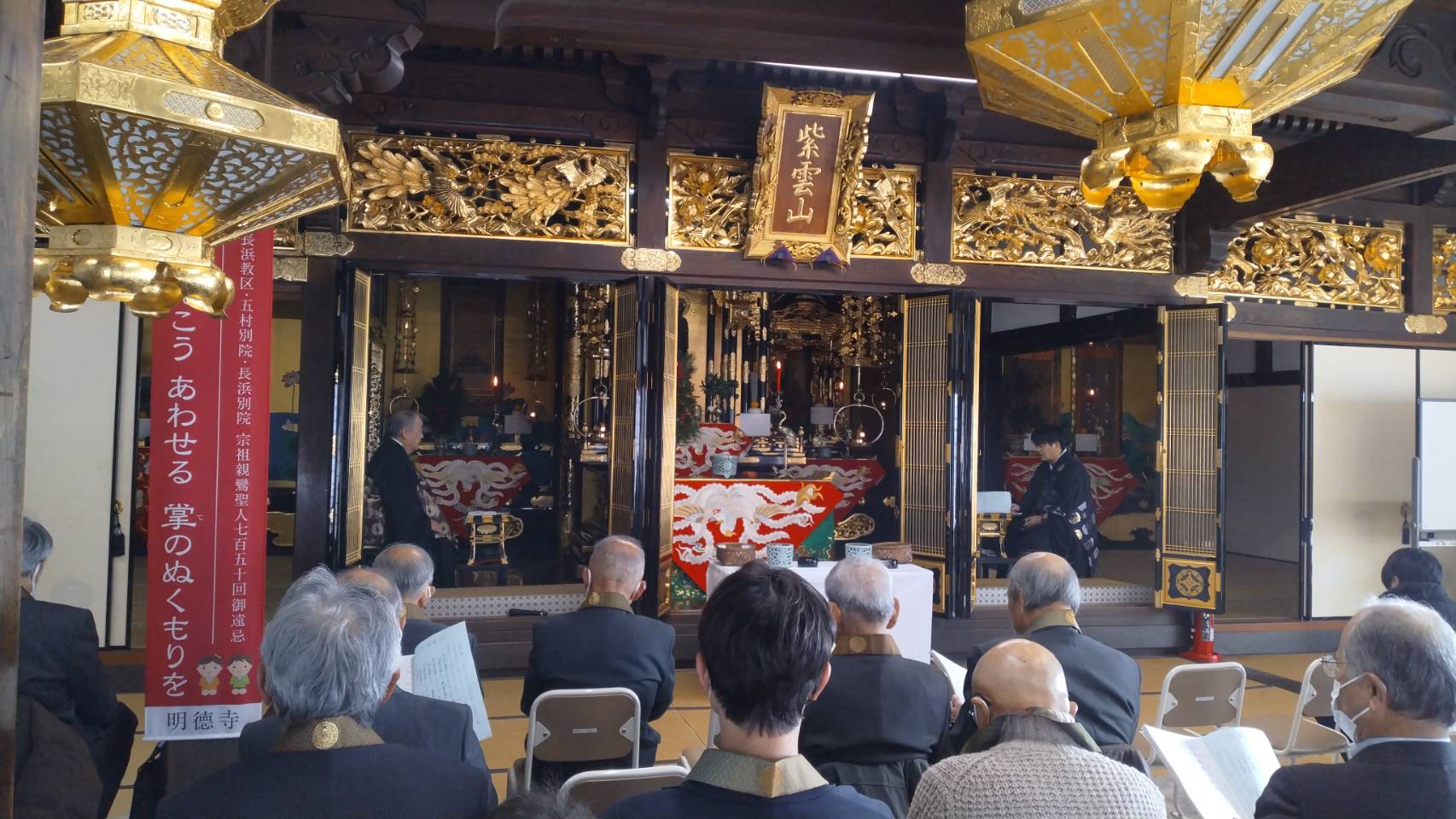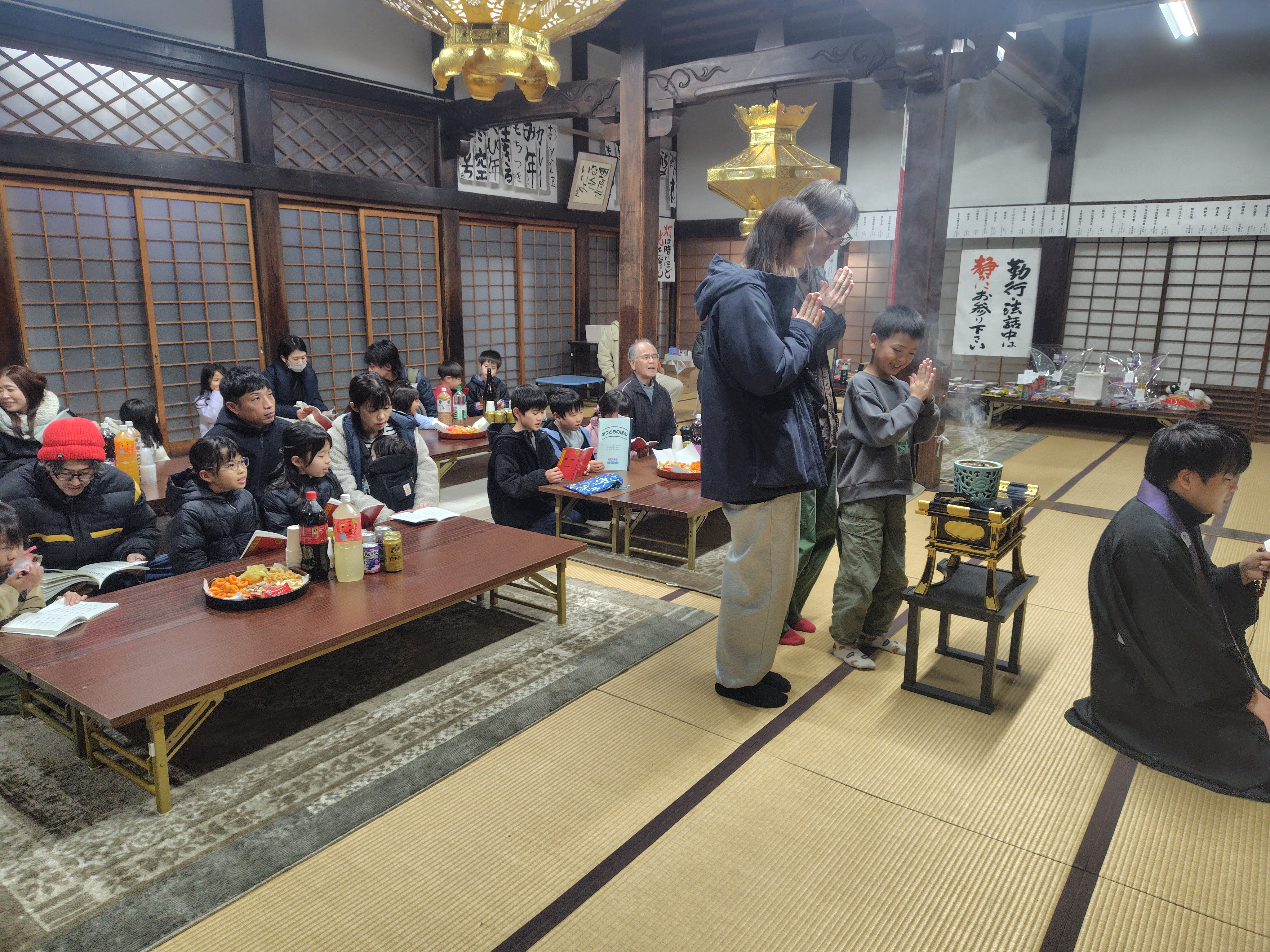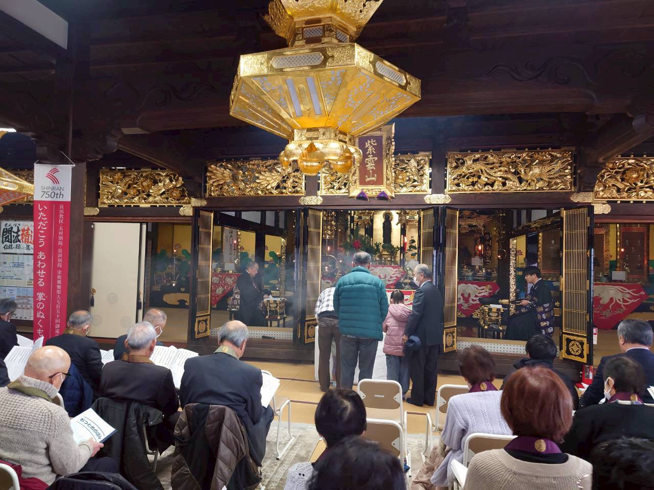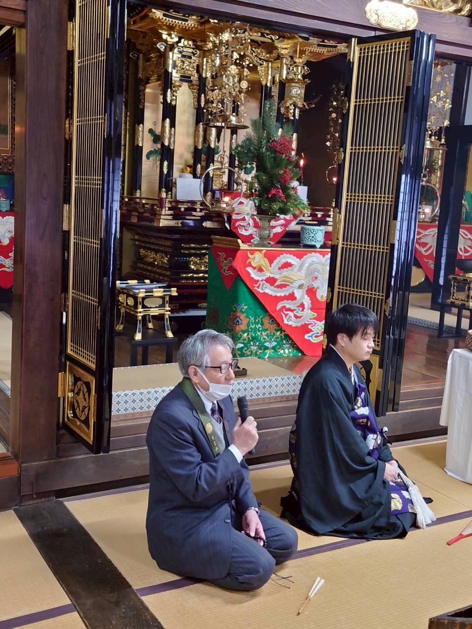 1月1日の「修正会」には約40人の方がお参りくださいました。お勤めが始まると順番にお焼香をしていただきました。阿弥陀経と正信偈のお勤めが終わると、住職が御文を拝読し、その後住職と神田責任役員が年頭の挨拶をしました。住職からは真宗における「修正会」の意味について話があり、神田責任役員からは、本堂屋根修理に対する役員会としての取り組みの現状について報告があり、ご理解とご協力を求められました。