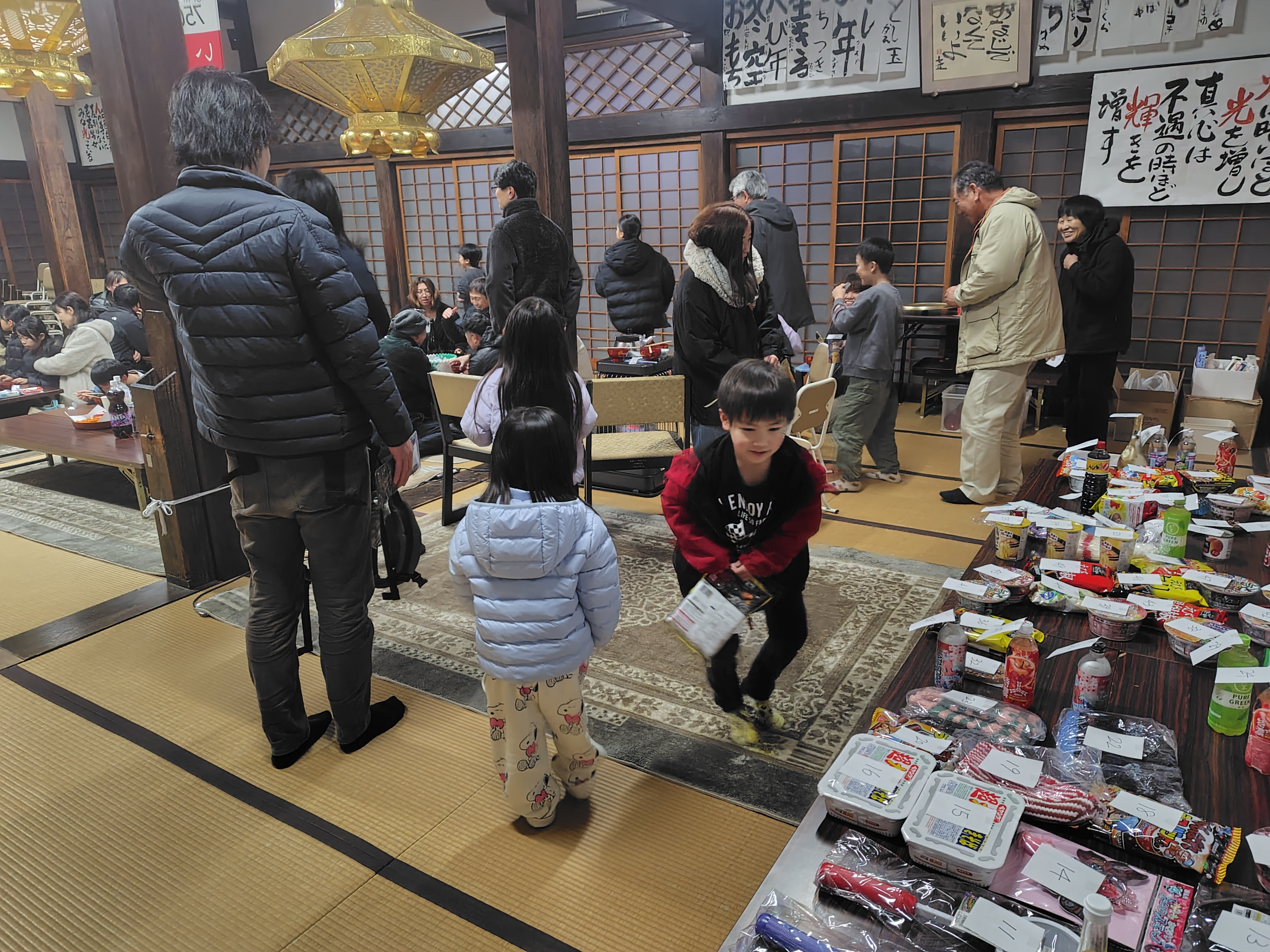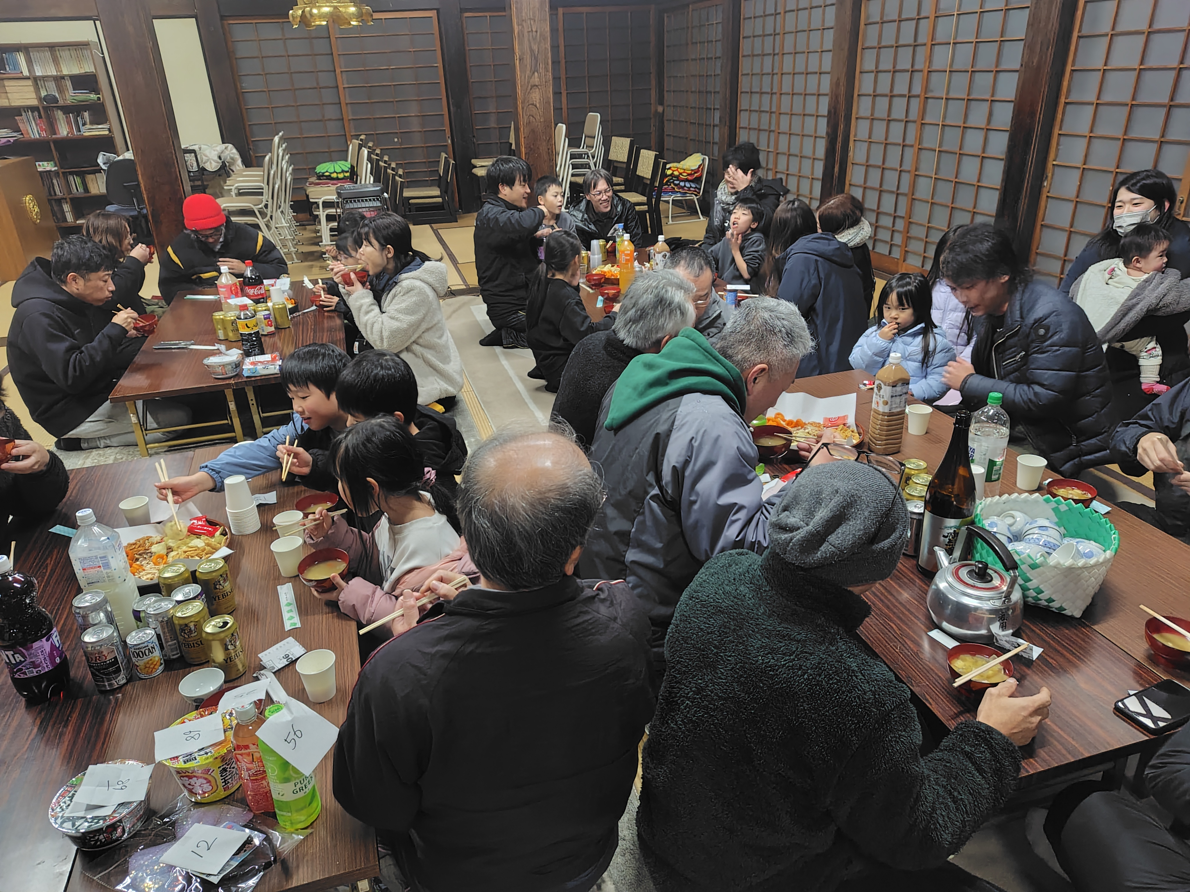 11時50分から住職導師の下で、皆さんと正信偈のお勤めをしました。その後境内に出て、鐘を108撞きました。撞き終わると本堂では、坊守の作った「豚汁」が振舞われ、お酒などを酌み交わしながら新年を祝いました。くじ引きもあり皆さん喜んでおられました。