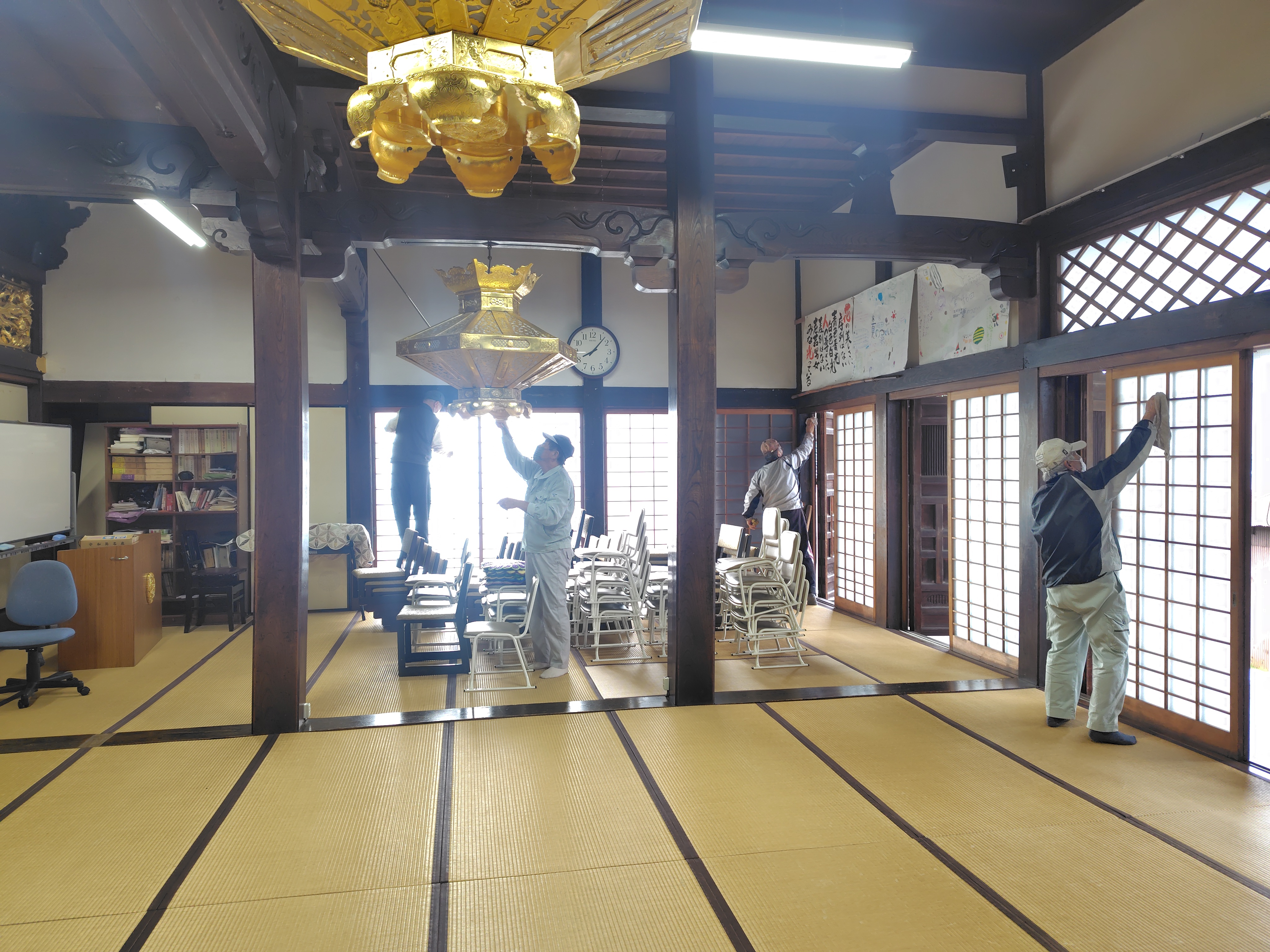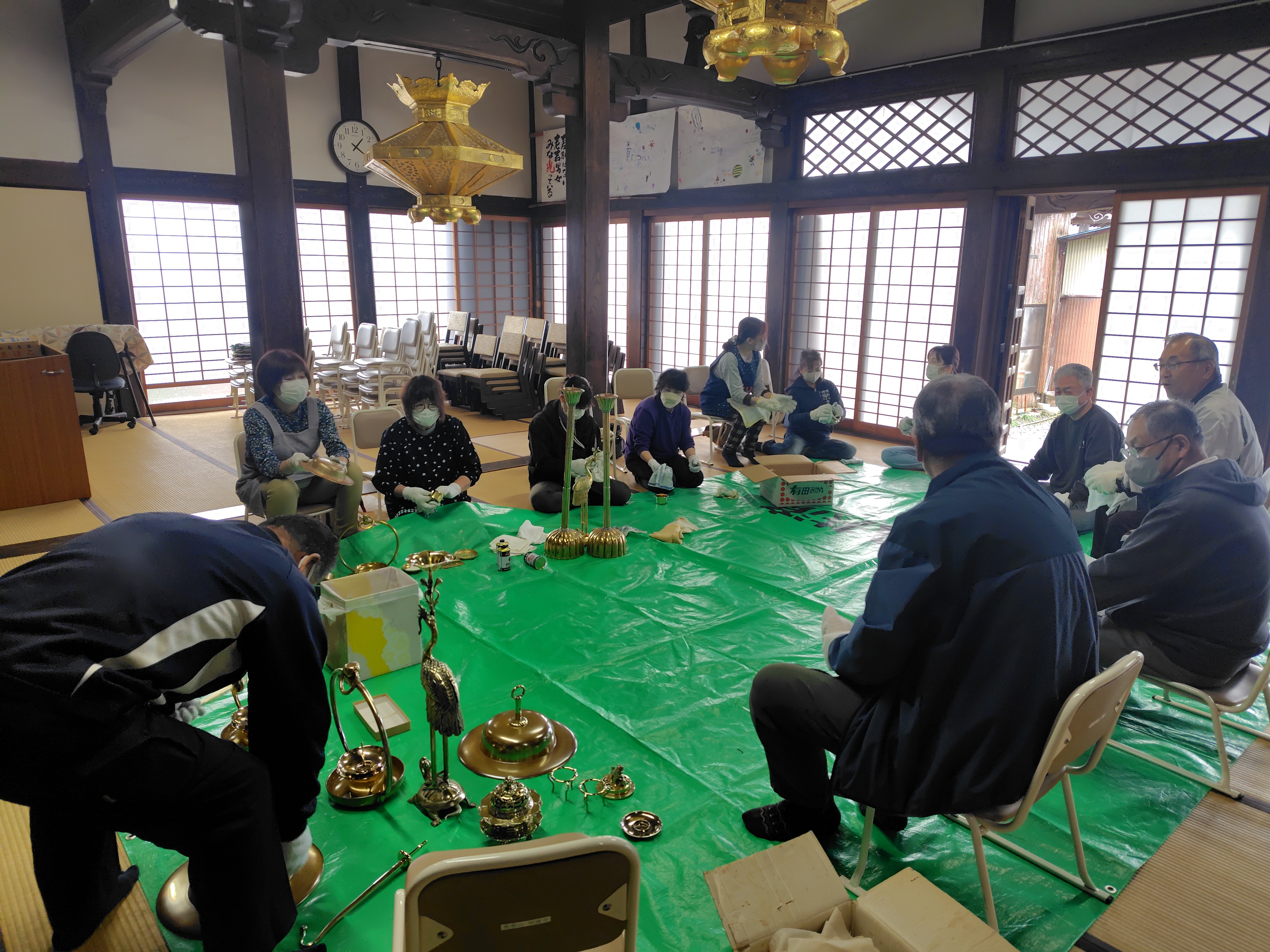 すす払いとお磨き 「すす払い」と「お磨き」作業 11月2日(日)午前8時から「すす払い」をしました。当番組は7組・1組・2組の皆さんで作業をしていただきました。 午後1時からは、世話方・女性部役員、総代等が出て「磨きもの」をしていただきました。寒い中での作業でしたが、無事に「報恩講」の準備ができて喜んでおります。